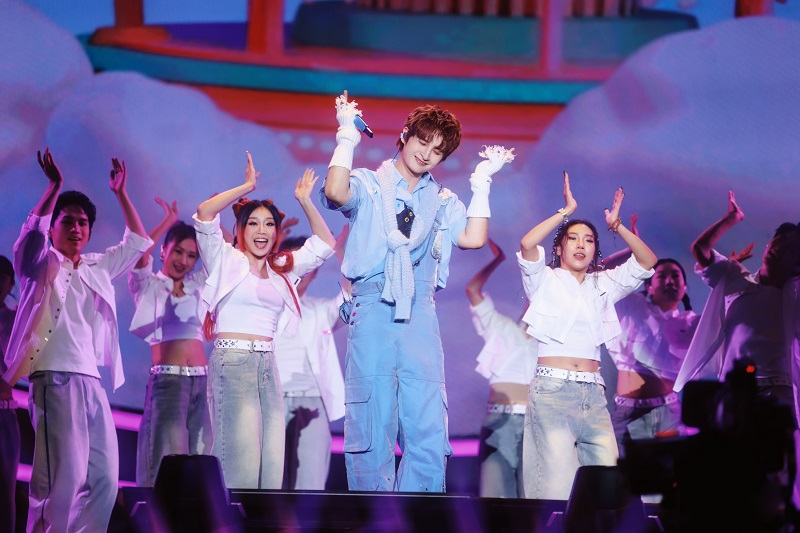 在响彻场馆的祝福声中,灯光亮起,冰屏展开,身穿蓝色背带裤的张远唱着他的经典代表作「那群傻瓜」跃入视线,成为全场瞩目的焦点。微卷的碎盖刘海,俏皮的舞蹈动作,可爱的互动方式,张远青春的模样正如他在社交平台上描述的自己——当下只是「第二个20岁」罢了,活力满格。